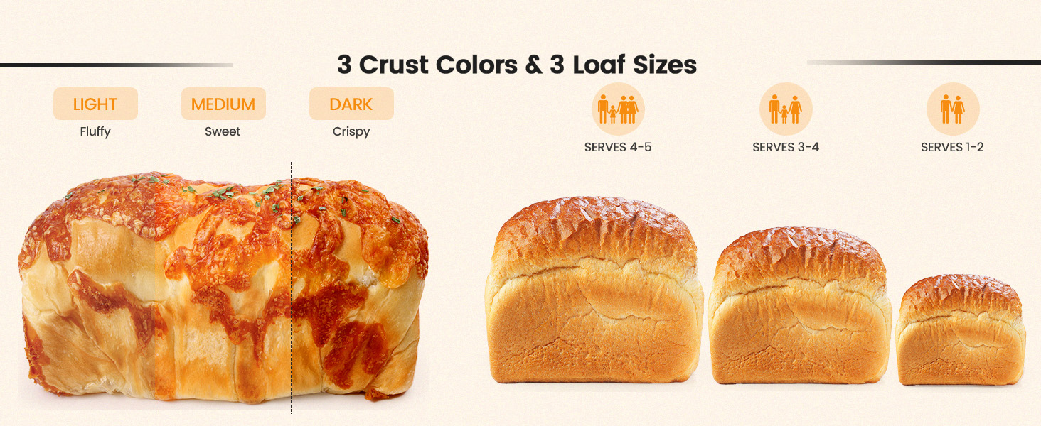 3 crust options for light/medium/dark, 3 loaf sizes fromW/1.5/2 lb