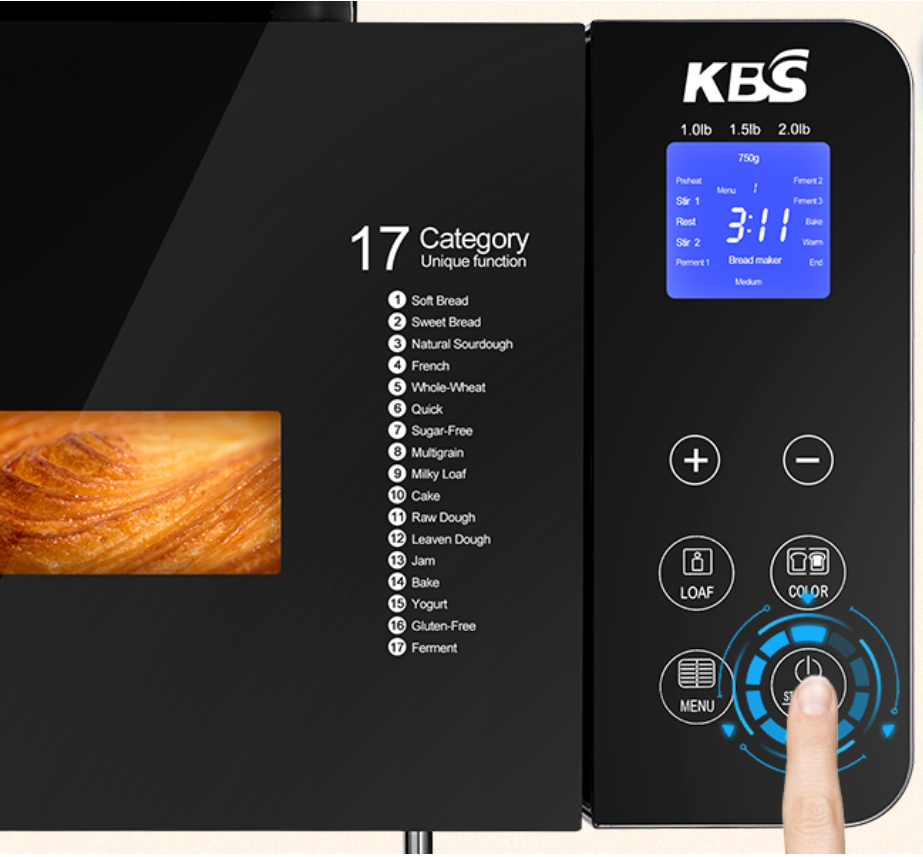 The KBS all-in-one automatic bread maker features 17 functions, including: Basic, Gluten-Free, Sourdough, French, Sweet, Whole Wheat, Multigrain, Milky Loaf, Sugar-Free, Quick bread, Cake, Jam, Yogurt,Dough,Rise,Bake. Customize your creations with 3 loaf sizes (1LB, 1.5LB, 2LB) and 3 crust colors (Light, Medium, Dark), 2LB bread machines for whole family. Explore 53 diverse recipes in the included book,perfect for bakers of all levels